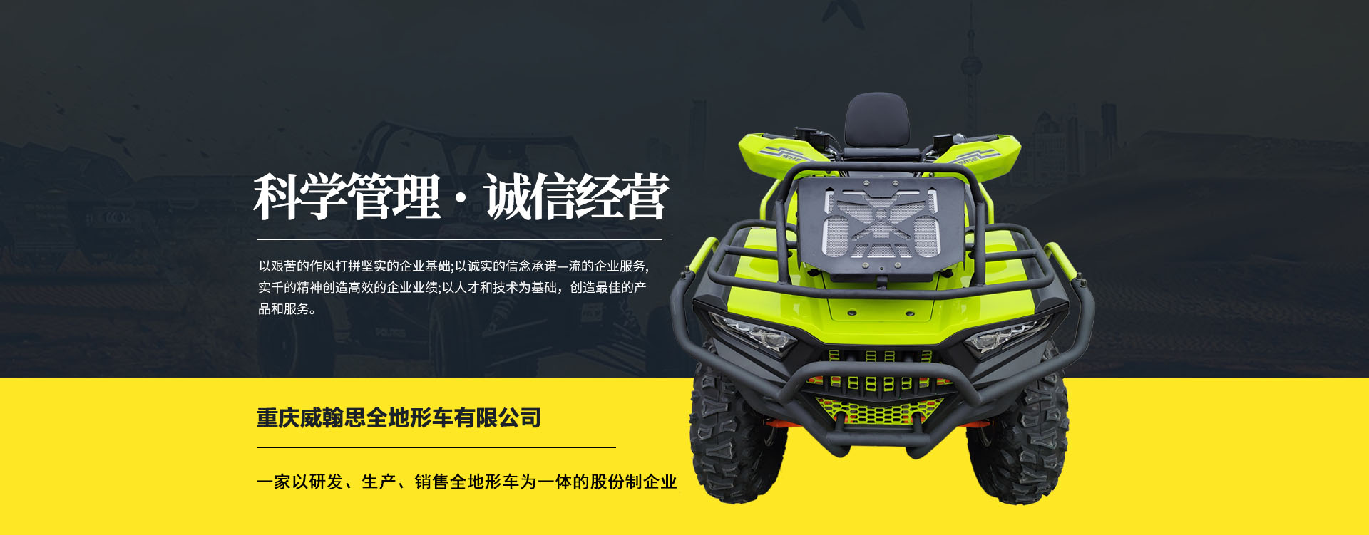 重慶威翰思全地形車有限公司成立于2016年9月,一家以研發(fā)、生產(chǎn)、銷售全地形車為一體的股份制企業(yè)。公司銷售額超過5000萬。現(xiàn)有專業(yè)市場售后服務(wù)團隊。公司秉承“敬業(yè)、超越、活力、用戶至上”的企業(yè)精神,“以人為本,合作共贏;”的核心價值觀,“嚴格管理創(chuàng)優(yōu)質(zhì)、名牌戰(zhàn)略拓市場”的質(zhì)量方針,使公司一步步邁上新的臺階。公司與重慶航天巴山摩托車制造公司達成戰(zhàn)略合作協(xié)議。共同出資致力于沙灘車旅游市場產(chǎn)品研發(fā),項自運營指導(dǎo),市場維護等全方位市場拓展。重慶航天巴山摩托車制造公司授權(quán);重慶威翰思全地形車有限公司為中國區(qū)唯─戰(zhàn)略合作伙伴。